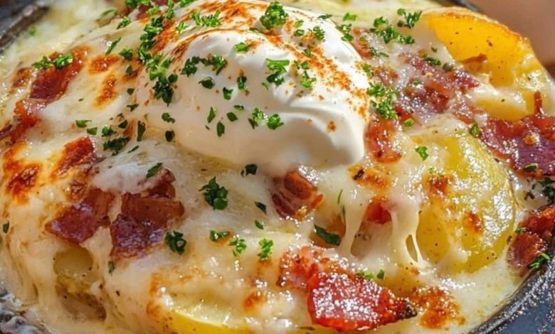 This Potato, Bacon, and Cheese Skillet is a comforting and flavorful dish perfect for any meal, combining the earthy taste of potatoes with the rich flavors of bacon and melted cheese, topped with a cooling dollop of sour cream.