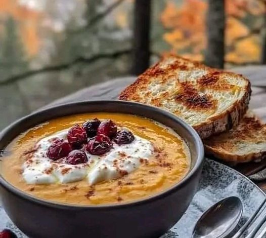 • Ladle the soup into bowls. Top each with a dollop of cream and a few cranberries for a burst of color and flavor.