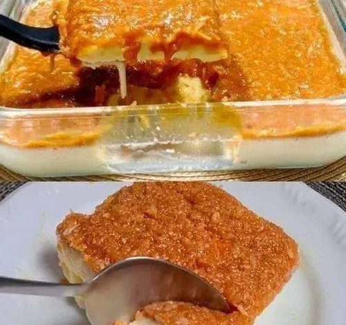 • Pour the pumpkin mixture over the caramel in the baking dish.