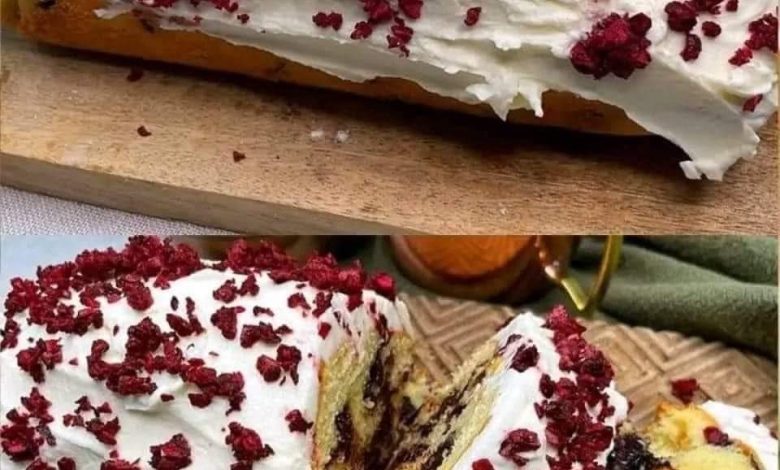 • Just before serving, top the roll with additional whipped cream and sprinkle with crushed raspberries.