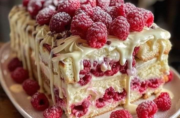 - Garnish with fresh raspberries, white chocolate shavings, and a dusting of powdered sugar.