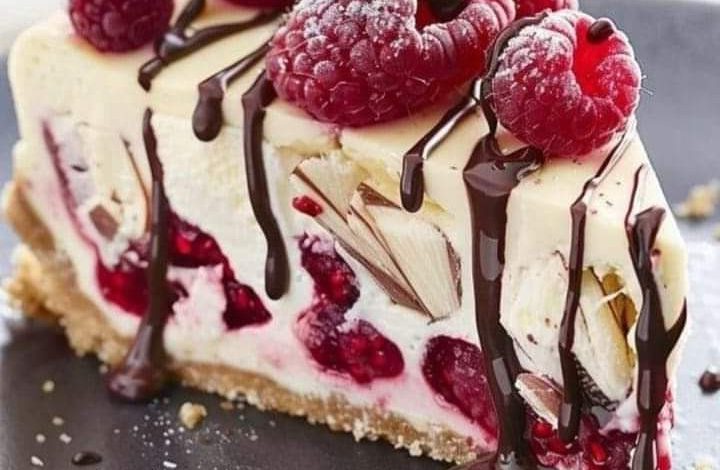 - After the ganache has been poured over the cheesecake, garnish with fresh raspberries.