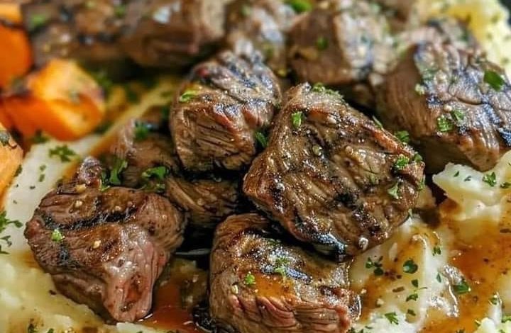Hearty Seared Beef Tips with Creamy Mashed Potatoes and Roasted Carrots”