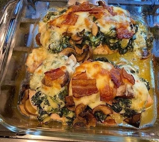 Remove the partially cooked chicken from the oven.Top each breast with creamed spinach, chopped bacon, caramelized mushrooms, and a slice of pepper jack cheese.