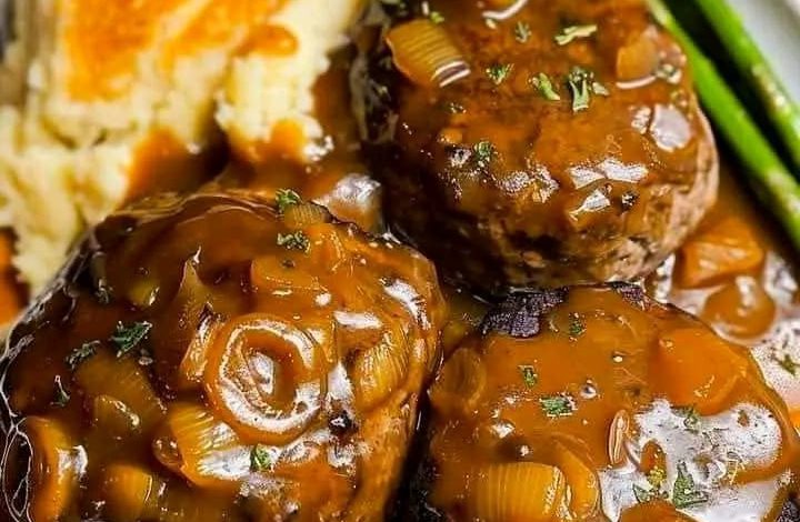Salisbury steak with onion gravy and mashed potatoes is a timeless comfort food that delivers bold flavors and satisfying textures. The tender beef patties, smothered in savory onion gravy, complement the creamy mashed potatoes perfectly, making every bite a delight. Whether served for a family dinner or a special occasion, this dish is sure to bring warmth and happiness to the table. Enjoy this homestyle classic and savor its rich flavors!