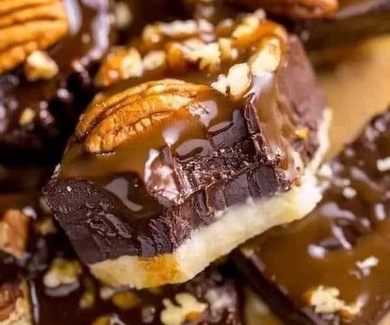 In a microwave-safe bowl, mix the chopped chocolate, condensed milk and butter.Microwave uncovered on low in 30 second increments, stirring between each increment, until chocolate is completely melted. Stir the mixture until smooth. Add vanilla extract. Spread the mixture over the shortbread cookies and smooth it with a spatula until it forms an even layer. Pour salted caramel over chocolate mixture, then sprinkle with toasted pecans. Refrigerate until solid; about 2 hours.Cut into small squares and serve. !