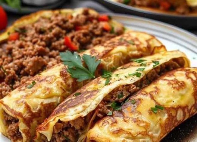 - Serve the salted pancakes with minced meat warm, garnished with fresh herbs if desired.