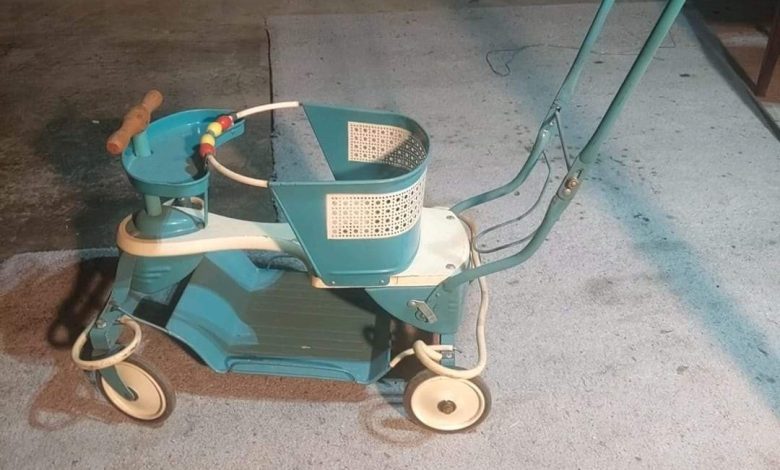 The design and functionality of children’s toys and aids, such as walkers, have seen significant transformations over the decades. The vintage walker in the image, with its sturdy metal frame and playful design, offers a snapshot into the past, highlighting how these childhood staples have evolved not only in design but also in safety and educational value. This exploration into the history of children’s walkers sheds light on broader shifts in perceptions of childhood, parenting, and safety.