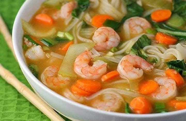 - Ladle the hot shrimp and vegetable soup over the noodles.