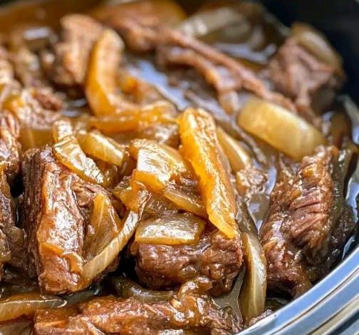 Cover and cook on LOW for 6–8 hours or HIGH for 3–4 hours, until the beef is fork-tender and the onions are soft and flavorful.