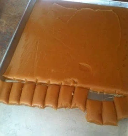 6. Cool & Cut: Let the caramel sit at room temperature for about 2-3 hours until firm. Once set, use a sharp, greased knife to cut it into small, bite-sized pieces.