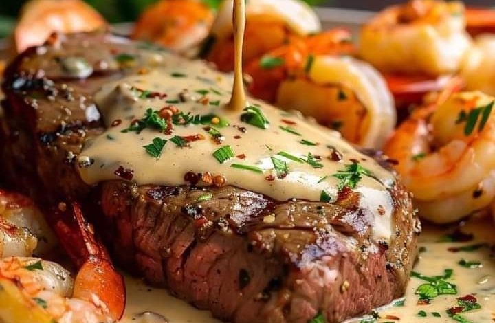Steak with Creamy Garlic Herb Sauce and Shrimp