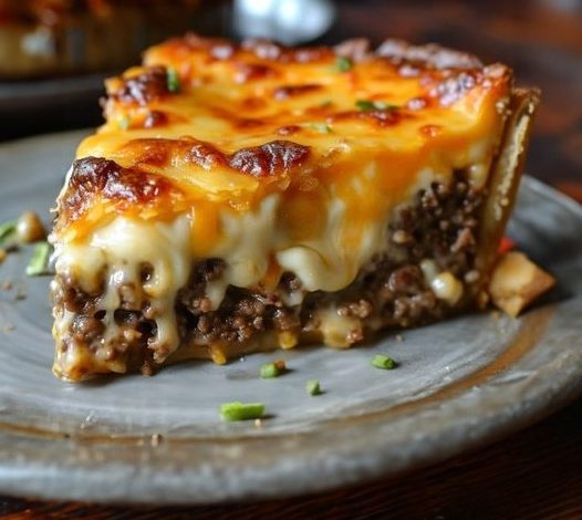Serve hot and enjoy this comforting slice of cheeseburger pie.