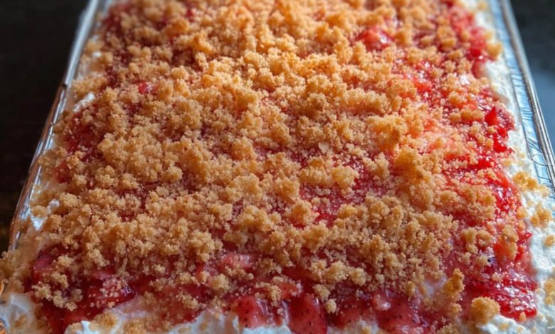 Strawberry Crunch Cheesecake Dessert is a creamy, fruity, and delightfully crunchy treat that combines the rich indulgence of cheesecake with the fresh sweetness of strawberries and the irresistible texture of a crumbly topping. Perfect for summer parties, family gatherings, or potluck events, this dessert is made in a large pan, making it ideal for serving a crowd. Its layers of smooth cream cheese filling, juicy strawberries, and buttery crumble create a harmonious blend of flavors and textures that will have everyone coming back for seconds.