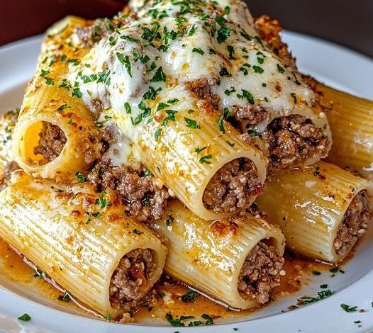 - Using a small spoon or piping bag, fill each piece of rigatoni with the meat mixture. Set the stuffed pasta aside.