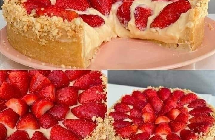 - Arrange the strawberry halves on top of the chilled cheesecake in a circular pattern.