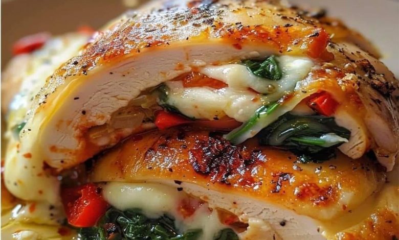 - Layer the spinach, roasted red peppers, and shredded mozzarella cheese inside each chicken breast pocket.