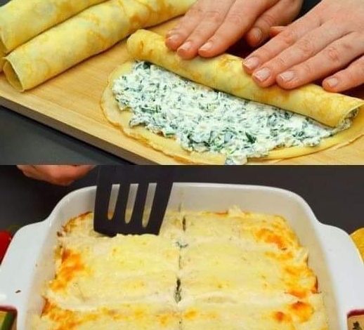 • Repeat with the remaining crepes and filling, arranging them in a single layer in the baking dish.