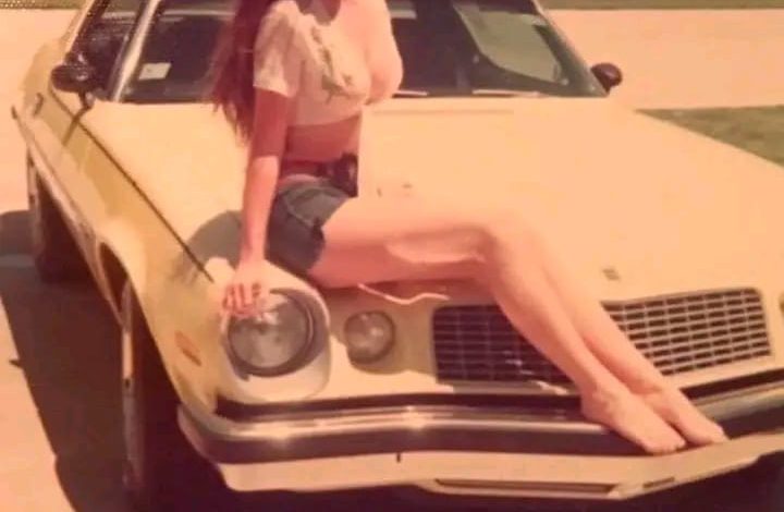 There are photos that capture moments — and then there are photos that capture eras. This image is more than just a young woman sitting on a car; it’s a window into a time when summer was endless, fashion was free-spirited, and the American muscle car reigned supreme. It’s a scene right out of a ’70s postcard: sun-kissed skin, high-waisted shorts, and a Camaro that gleams like a golden dream under the blazing sky.