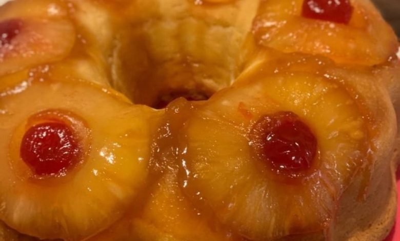 Place the base of the pan with the pineapple rings and place 1 cherry in the center of each pineapple ring.