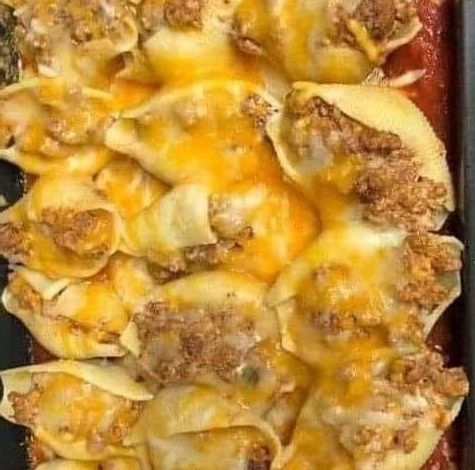 Add the cooked pasta and beef mixture along with the jumbo shells and place in a well-greased 9×13 pan.