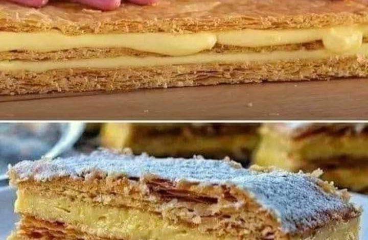 - Place one sheet of puff pastry on a serving plate. Spread half of the pastry cream over it. Top with the second sheet of pastry, followed by the remaining cream. Finish with the third sheet of pastry. Chill for at least an hour.