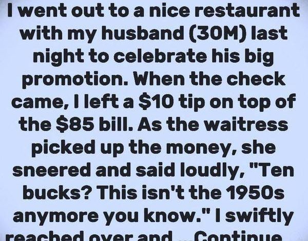 The couple, excited to celebrate a significant milestone, chose a nice restaurant for the occasion. After enjoying their meal, they received the bill, which totaled $85. The woman left a $10 tip, which, in her mind, seemed reasonable. However, the waitress’s reaction was anything but appreciative. As she picked up the money, she sneered and made a loud comment, “Ten bucks? This isn’t the 1950s anymore, you know.”