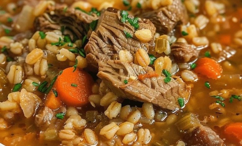 - Reduce the heat to a simmer and cover the pot. Cook for about 1 hour or until the barley and beef are tender.