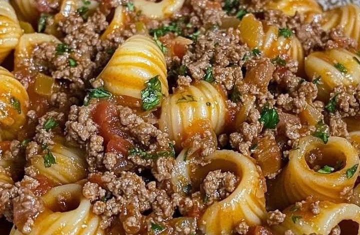 - Add the cooked pasta to the meat sauce and toss to combine. If the sauce is too thick, add a little of the reserved pasta water to loosen it up.