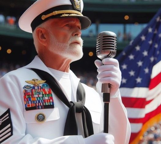 This image shows a naval officer, adorned with multiple medals and ribbons, indicating a high rank and significant service. The officer is standing solemnly, holding a microphone, possibly during a ceremony or a national anthem performance. The presence of the American flag in the background adds to the patriotic and ceremonial nature of the scene.