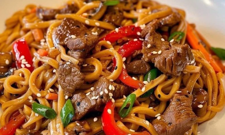 This stir-fry noodle dish is perfect for a quick and flavorful meal, combining tender beef, fresh vegetables, and savory sauces. Enjoy!