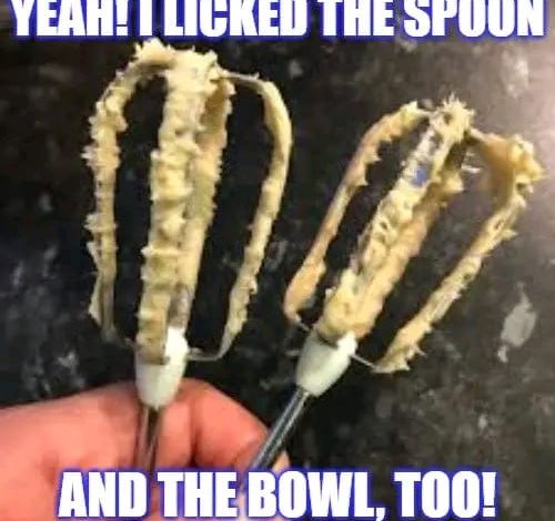 Presentation: The image presents a familiar scene for anyone who loves to bake: electric mixer beaters coated with remnants of dough, symbolizing the end of a baking session. The caption, “Yeah! I licked the spoon and the bowl, too!” adds a humorous and relatable comment that resonates with many. It captures not only the act of enjoying the uncooked mixture but also the universal joy found in these small, guilty pleasures of the kitchen.