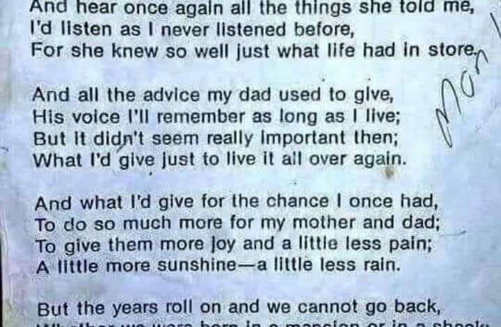 The imagery of “more sunshine and a little less rain” conveys the desire to bring more happiness to parents while they are still with us. It is a plea to cherish loved ones while there is still time, to express gratitude, and to spread joy instead of sorrow. The poem teaches us that though we cannot change the past, we can influence the future by showing appreciation and love to those who matter most.