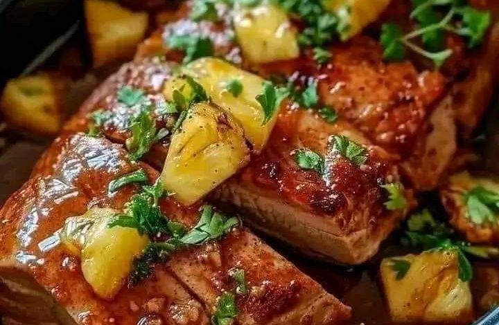 the pork and onions in fried pineapple pieces