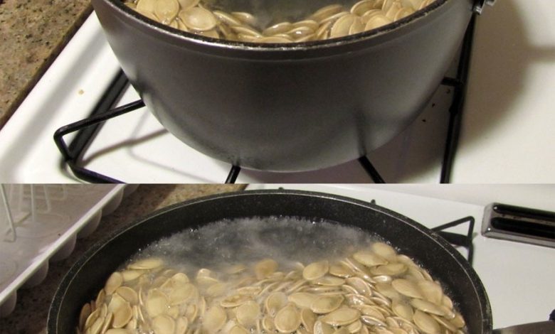 - Add the pumpkin seeds to the boiling water and reduce the heat. Let them simmer for about 10-15 minutes.