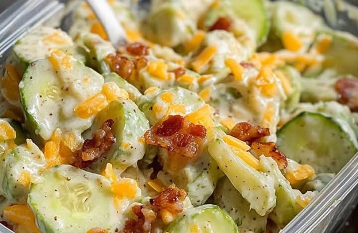 - Combine ingredients: In a large bowl, combine the cucumbers, bacon, and cheese. Pour the dressing over the salad and toss to coat.