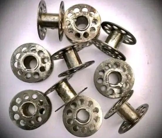 Design and Material: Early sewing machine bobbins, like those in the image, were typically made from metal. This material was favored for its durability and the smooth surface that allowed for uninterrupted thread release. The perforations seen in these bobbins are not merely decorative; they help reduce the bobbin’s weight and maintain the thread’s tension, crucial for producing consistent stitches.