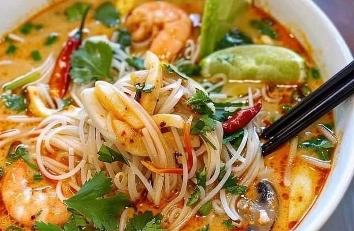 - Ladle the hot Tom Yum soup over the noodles, ensuring each bowl gets an equal share of shrimp and mushrooms.