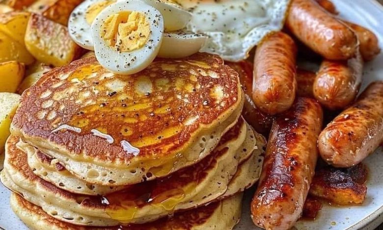 • Serve the traditional English breakfast with pancakes hot, with additional butter and maple syrup if desired.