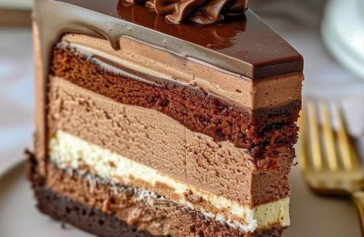 Enjoy the rich, creamy layers of this decadent Triple Chocolate Mousse Cake, perfect for any special occasion or as a show-stopping dessert!