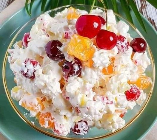 • In a large bowl, combine the pineapple chunks, mandarin orange segments, halved cherries, mini marshmallows, and shredded coconut.