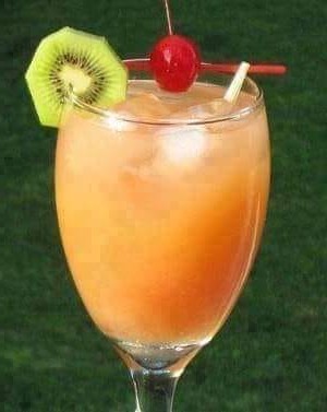 - Garnish the cocktail with a maraschino cherry and a slice of kiwi on the rim of the glass.