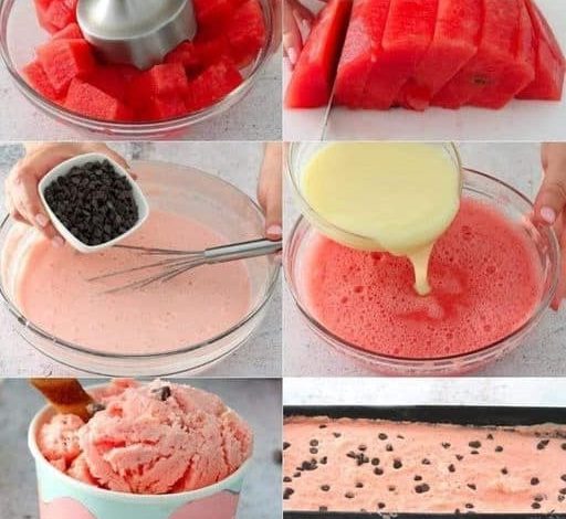 • Once frozen, scoop the watermelon ice cream into bowls or cones and serve immediately. Garnish with additional chocolate chips if desired.