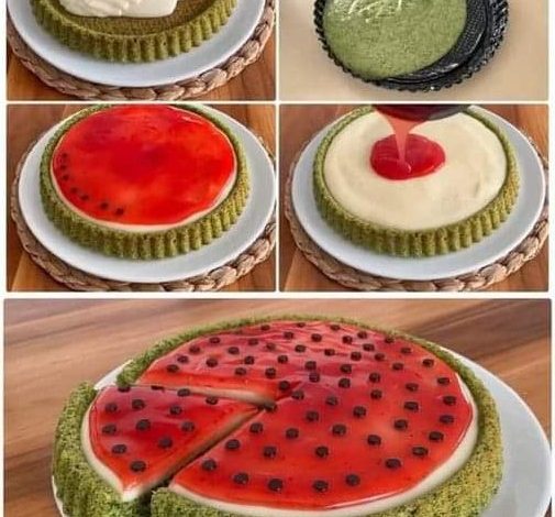 - Carefully slice and serve your watermelon-themed dessert chilled.
