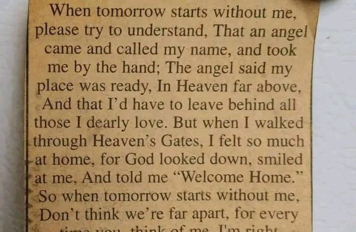 Conclusion: “When Tomorrow Starts Without Me” is more than just a poem; it’s a source of comfort and strength for anyone coping with the loss of a loved one. Its message is timeless, offering a gentle reminder that love remains, unbroken by physical absence. For those left behind, this poem encourages them to cherish the memories and find peace in knowing that their loved ones are watching over them, forever present in their hearts. In the end, it teaches us that true love never fades, even as tomorrow begins without them.