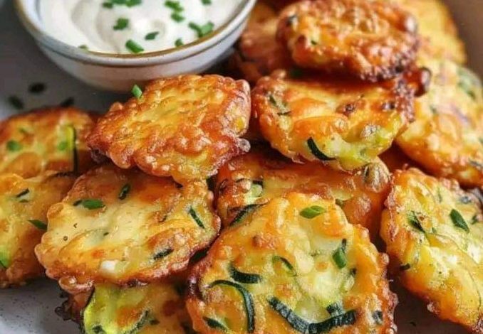 Enjoy your crispy and savory zucchini fritters with the tangy dipping sauce!